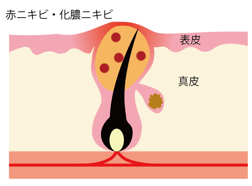 しかし、化膿したニキビは、酸化した皮脂とともにニキビ菌が増殖した状態です。そのため、皮膚表面を傷つける他に、真皮の組織まで傷つけられてしまいます。