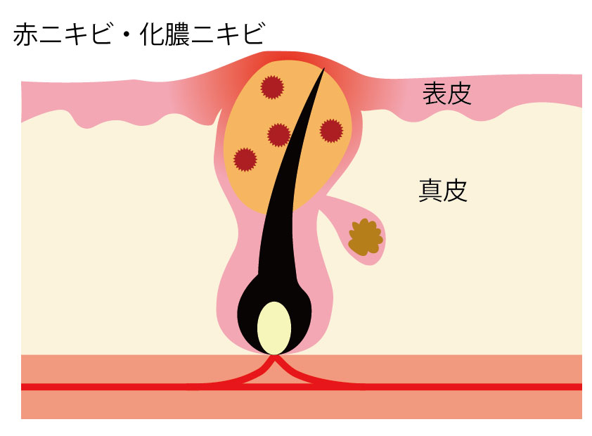 皮脂がたくさんあることで、ニキビ菌は増加し、分泌された遊離脂肪酸が赤ニキビや化膿ニキビへ進行させていきます。