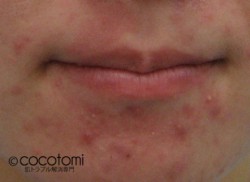 頬にニキビが繰り返し起きている為、ニキビ跡の赤みと新しいニキビの赤みが入り混じっている状態。化膿し始めているニキビもあったため、早急に対策をしました。