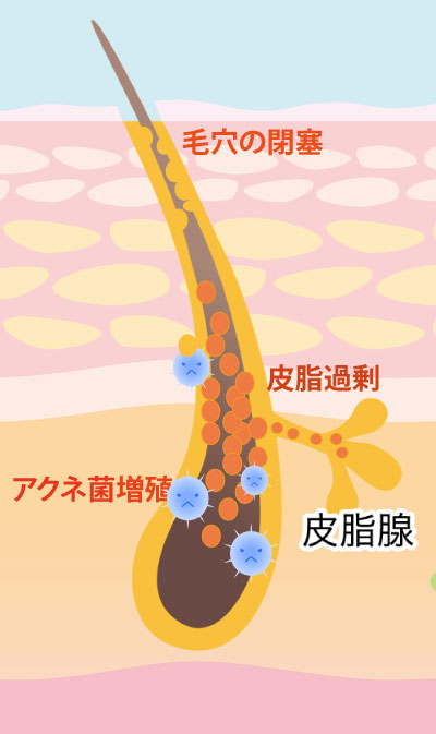 ニキビのできるメカニズムは毛穴の塞がり、皮脂過剰、アクネ菌などの増殖の条件が重なることで、発症します。