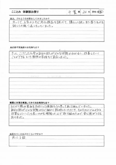 「こことみ」を見つけて、きっとここだったら、自分の肌のがどんな状態かわかるし、改善していくことができるという期待の気持ちで来店しました。
