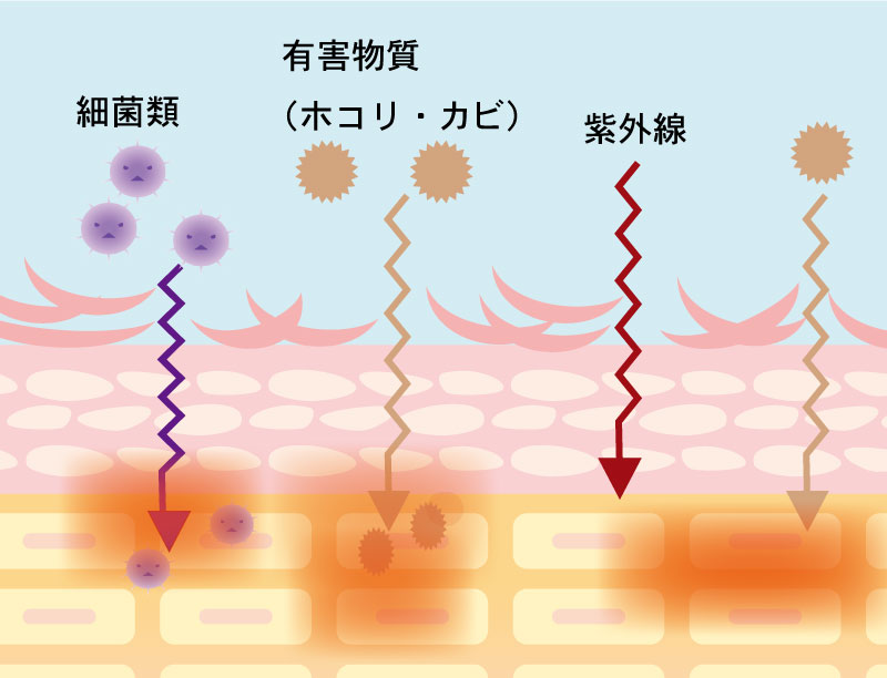 肌に異物が付着しても、侵入することがないので、顔がヒリヒリするとか、痒くなるとか、赤みがでてくるなどの症状が起きないのです。