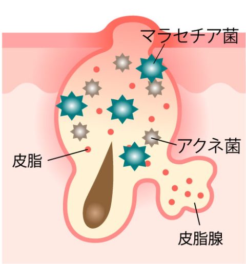 ニキビ菌もマラセチア菌も皮脂を餌として増殖してきます。そのため、皮脂が多いとニキビ菌もマラセチア菌も増殖する可能性があるということです。
